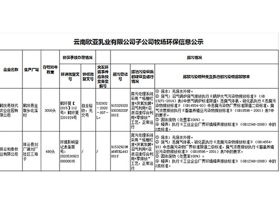 云南歐亞乳業有限公司子公司牧場環保信息公示